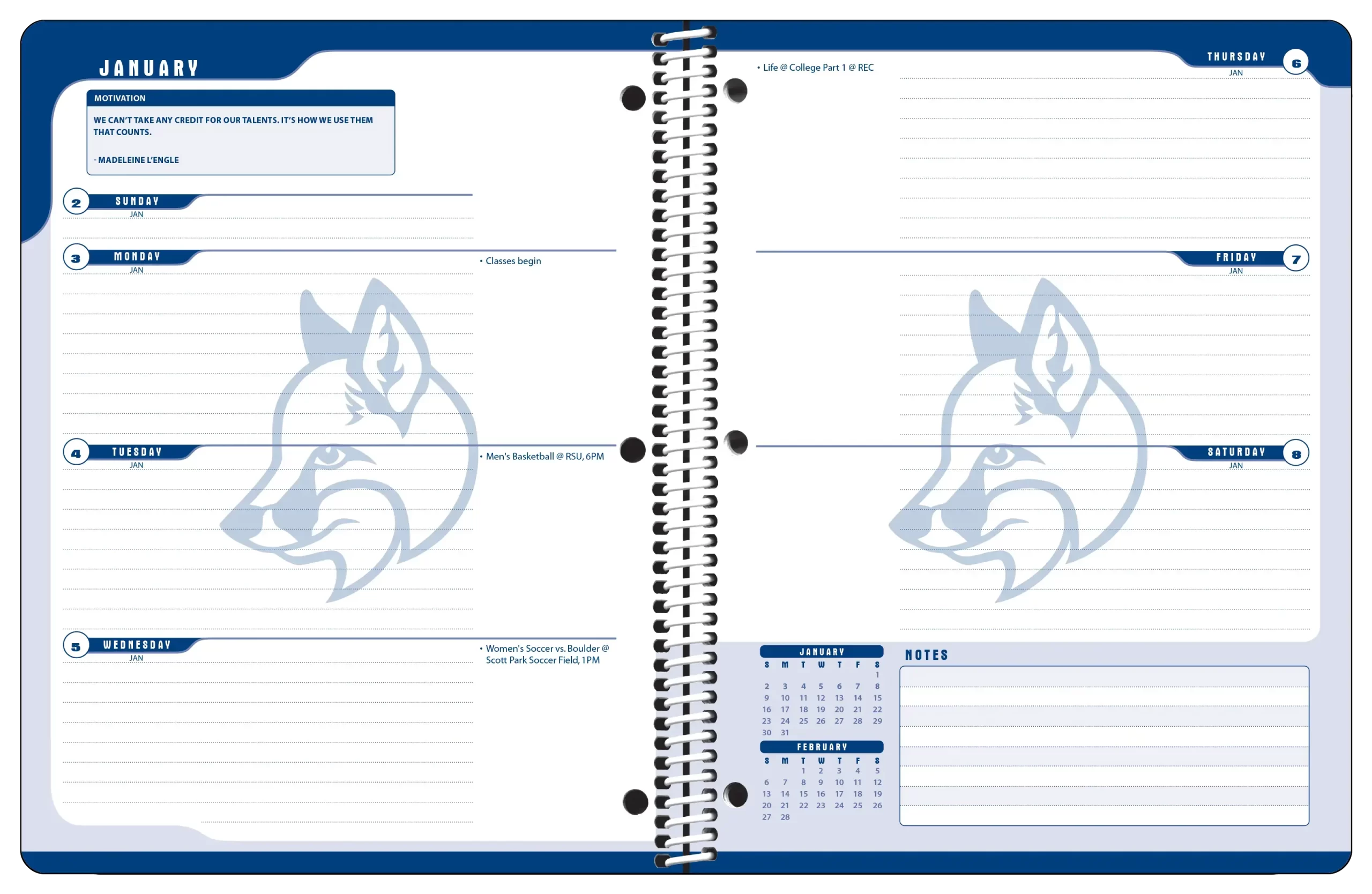• One Month Over Two Pages: This option presents the monthly calendars as two-page spreads interspersed between the weekly pages.