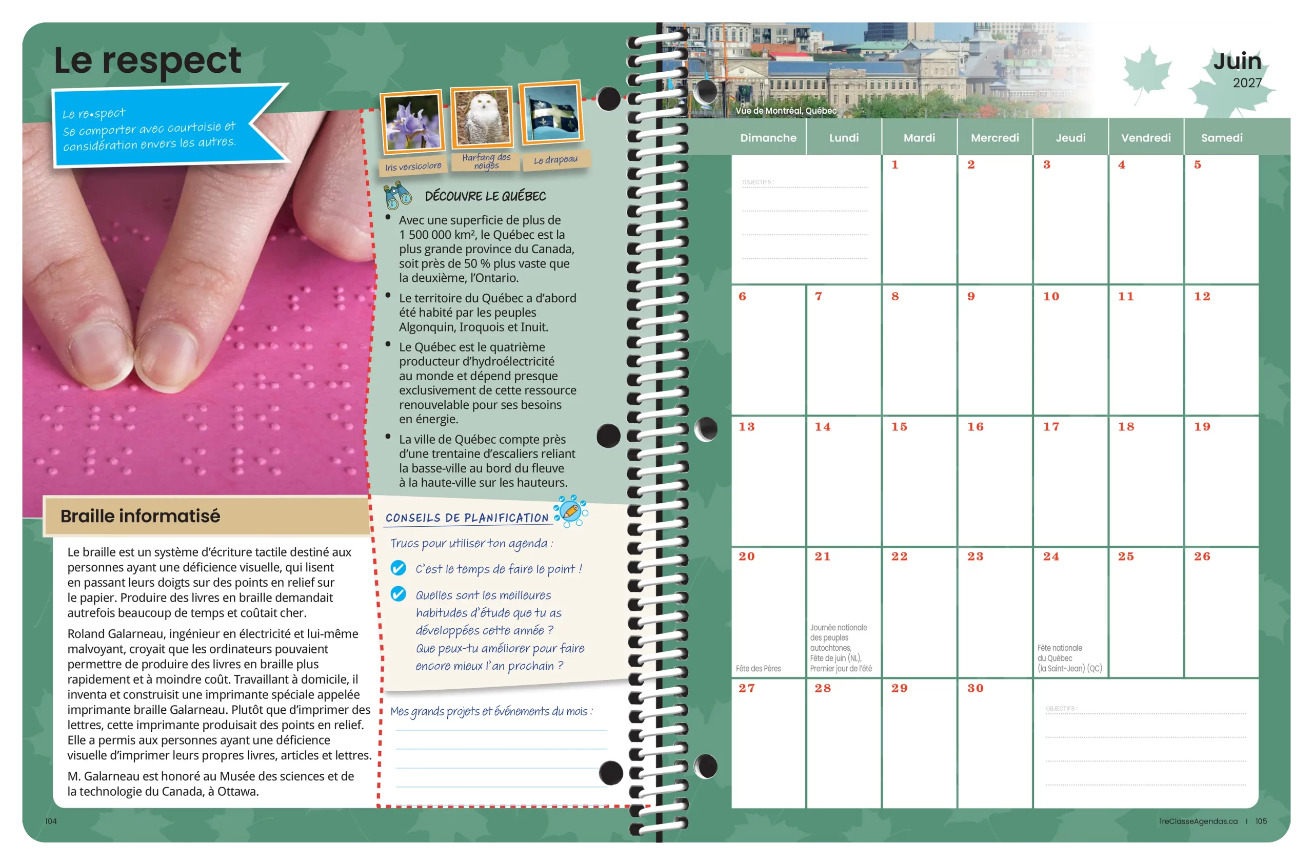 • Calendrier, avec mention des journées spéciales.